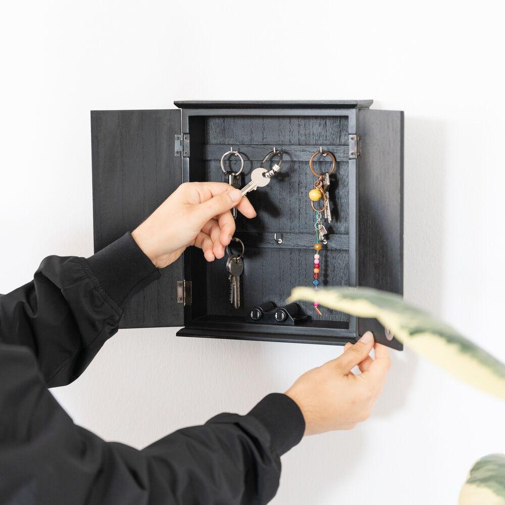 Por su parte, el colgador de llaves Puerta de Moria es una pieza decorativa y funcional que destaca por su diseño inspirado en las legendarias puertas élficas. Fabricado en madera MDF, cuenta con unas dimensiones de 21 x 26 x 6 cm y dispone de 6 colgadores de aluminio en su interior, permitiendo organizar fácilmente tus llaves. Incorpora un práctico sistema push-to-open que facilita su apertura, manteniendo el contenido protegido y ordenado.