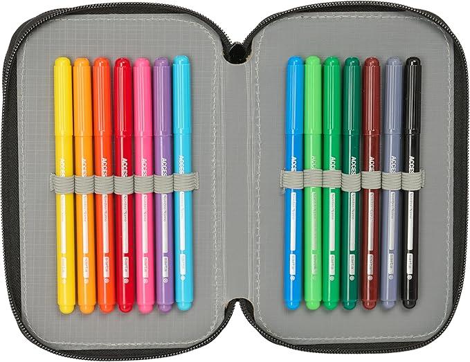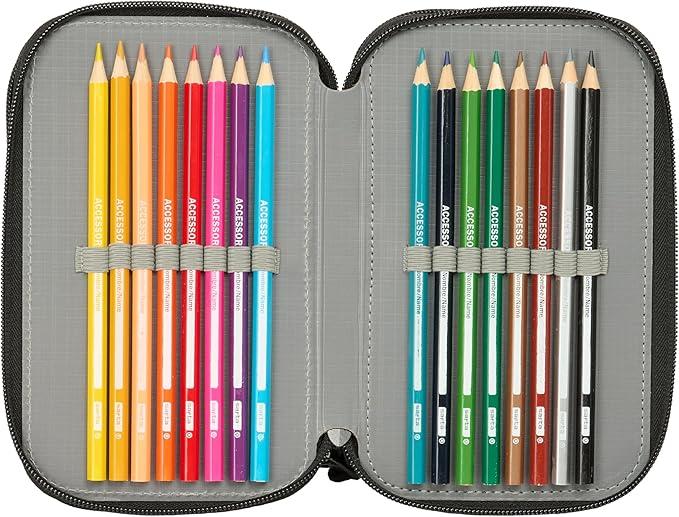 Con unas dimensiones de 12,5 x 5,5 x 19,5 cm, este estuche escolar tipo portatodo ofrece un formato compacto pero muy bien organizado gracias a sus tres compartimentos independientes con cremallera, que permiten clasificar todo el material de forma cómoda y accesible.