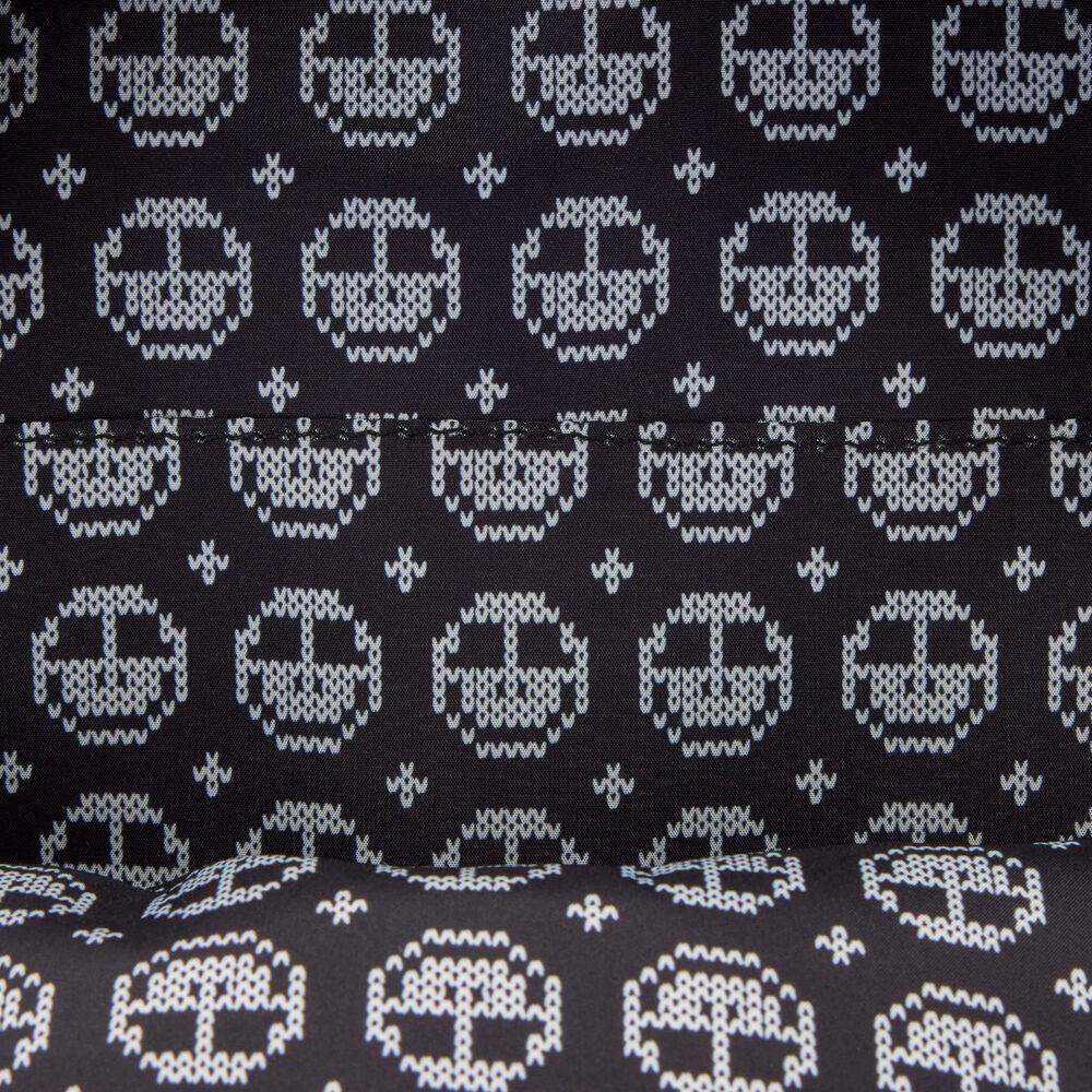 En la parte frontal, el rostro de Jack Skellington está formado por lentejuelas reversibles, que al deslizar la mano cambian su expresión por la de una calabaza brillante, creando un efecto sorprendente y divertido. El resto del diseño incluye detalles en relieve, bordados y estampados, que aportan profundidad y textura.