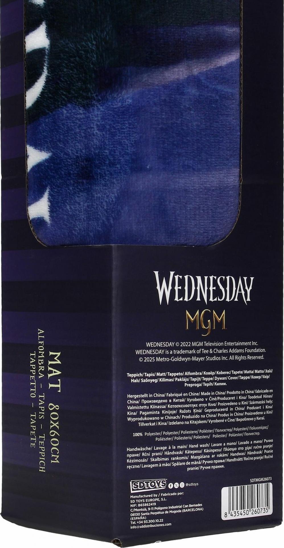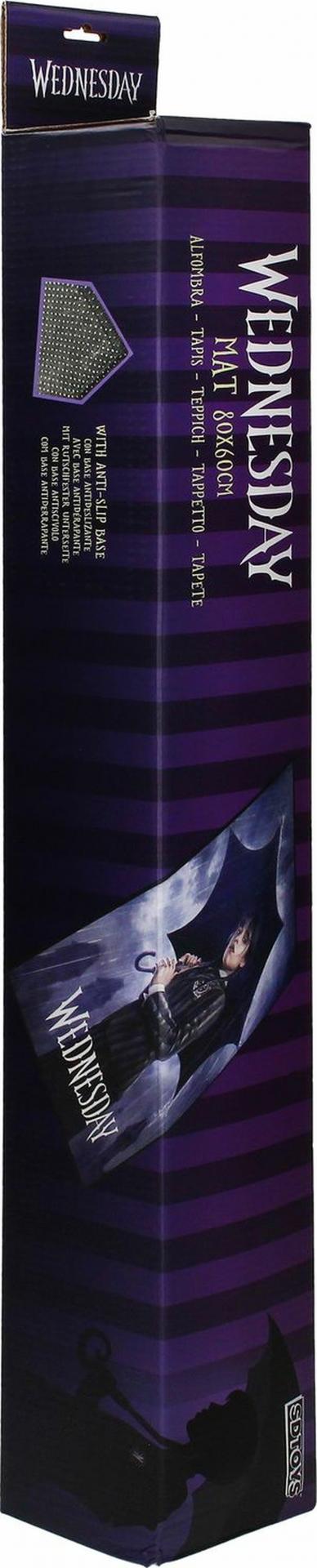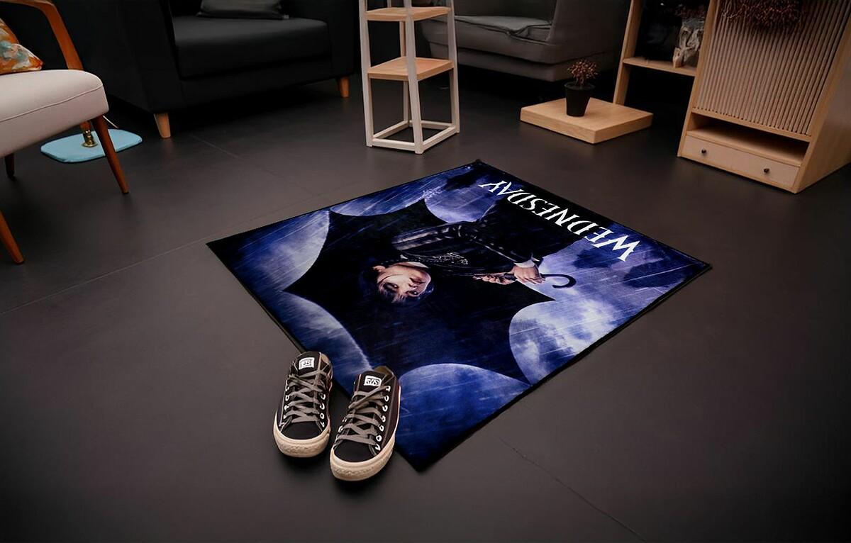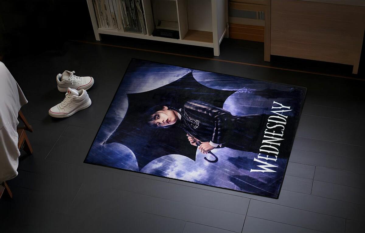 poliéster resistente, lo que le da un tacto suave, durabilidad y facilidad para limpiar. Colócala en tu habitación, sala de lectura o rincón favorito para que cada paso te recuerde el estilo característico de Wednesday. Una pieza imprescindible para cualquier coleccionista, friki de corazón o amante del lado más sombrío del buen gusto.