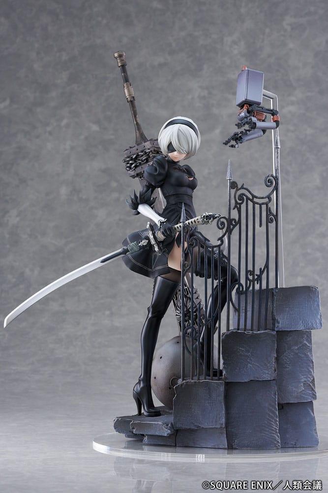 Se trata de una estatua oficial perteneciente a la línea Estatuas NieR, fabricada en PVC y presentada a escala 1/7, con una altura aproximada de 31 cm. El esculpido destaca por su gran nivel de detalle, desde la postura firme y estilizada del personaje hasta los pliegues del vestuario y su inconfundible expresión serena pero decidida. La figura transmite fielmente la dualidad de 2B, una androide creada para combatir, pero marcada por emociones y conflictos internos.