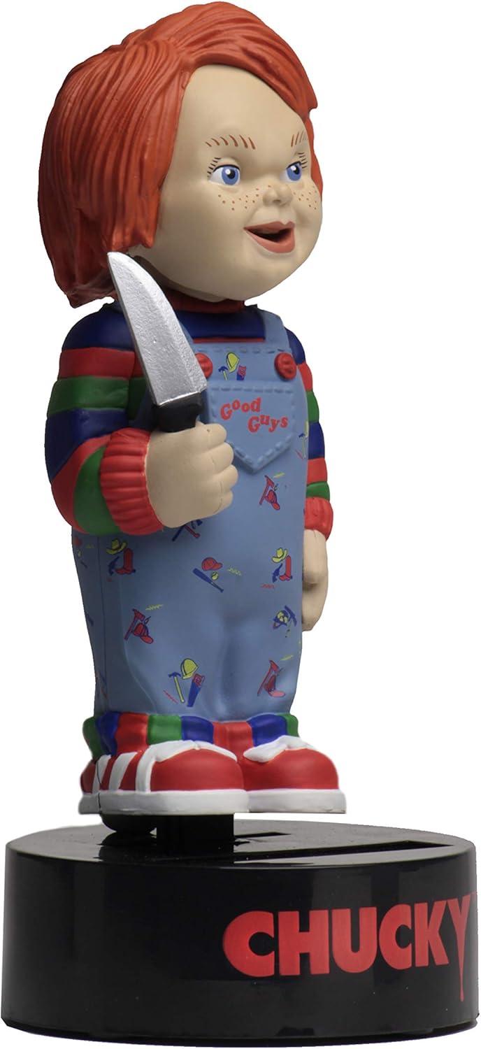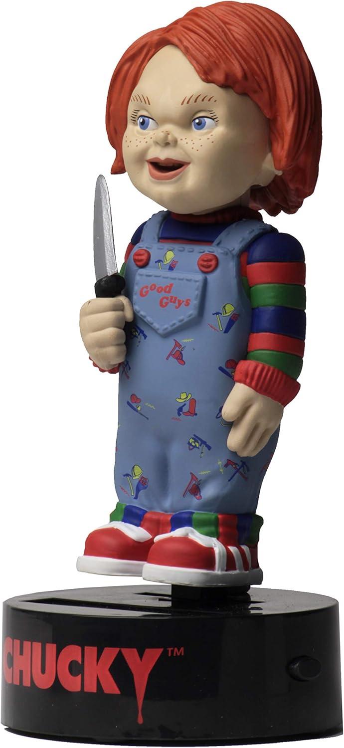 Fabricada con material resistente y detallado PVC/plástico, esta figura pertenece a la popular línea Body Knockers, reconocida por ofrecer figuras coleccionables que se balancean con la luz solar o artificial, sin necesidad de pilas. Su diseño captura con fidelidad los rasgos más reconocibles de Chucky, desde su expresión inquietante hasta su icónico traje de “Good Guys”, convirtiéndola en una pieza ideal para exposición en vitrinas, estanterías temáticas o espacios dedicados al cine de terror.