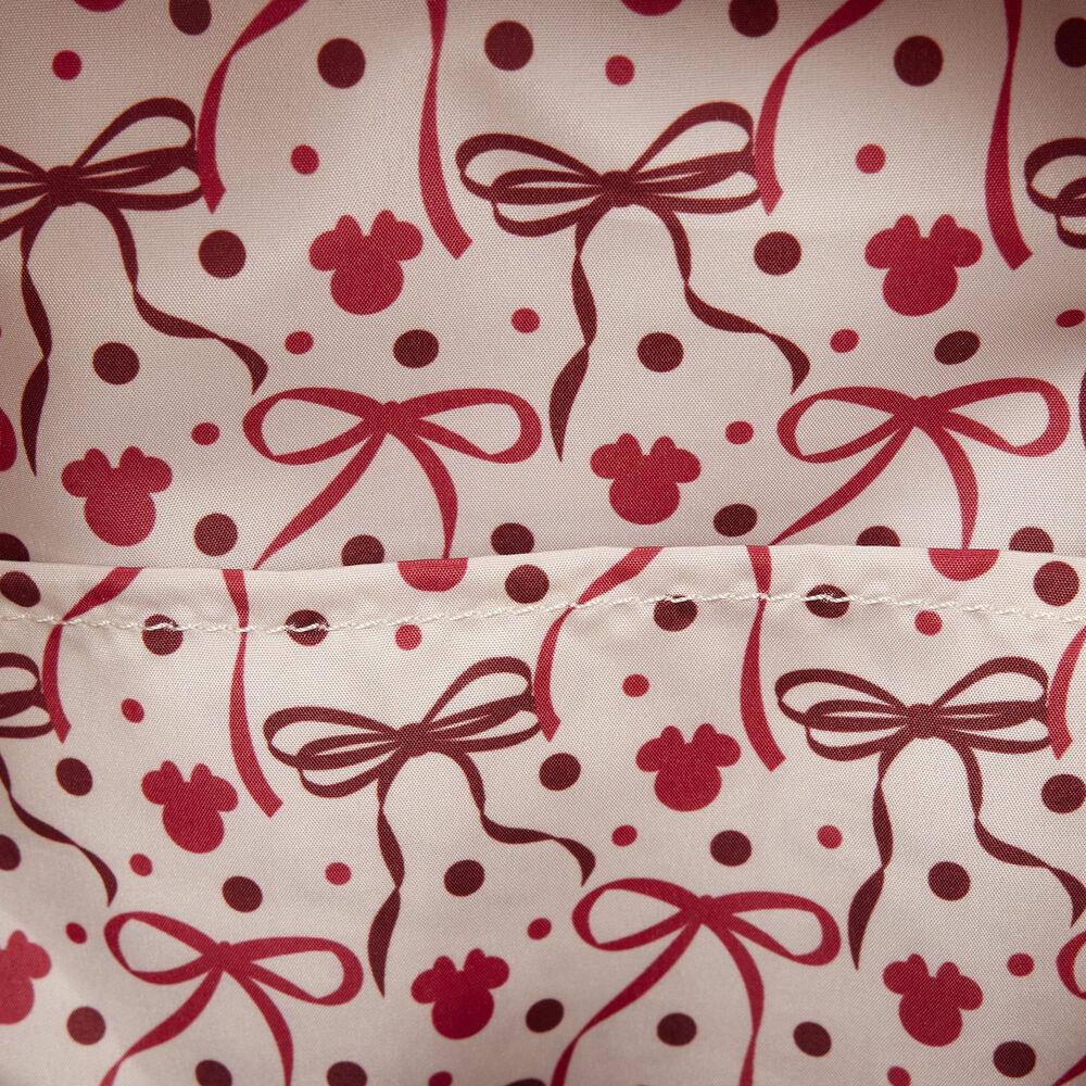 El diseño incluye un lazo 3D característico de Minnie, acompañado de apliques, detalles en relieve, cinta de raso y estampados que aportan profundidad y personalidad al conjunto. El acabado con ribete satinado le da un toque elegante que encaja perfectamente con la estética coquette.