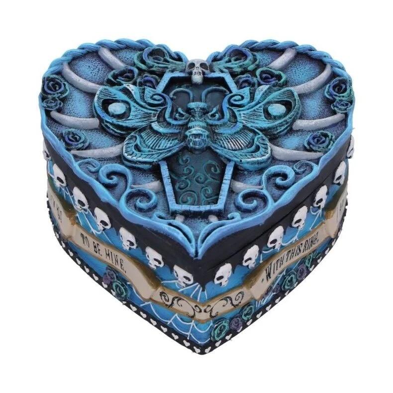 Además de su valor decorativo, esta caja ofrece un espacio interior amplio, ideal para guardar joyas, anillos u otros pequeños objetos personales, aportando un toque práctico a su diseño. Su tamaño compacto la convierte en una opción perfecta tanto para estanterías como para mesitas, integrándose fácilmente en cualquier ambiente con estilo gótico o vintage.